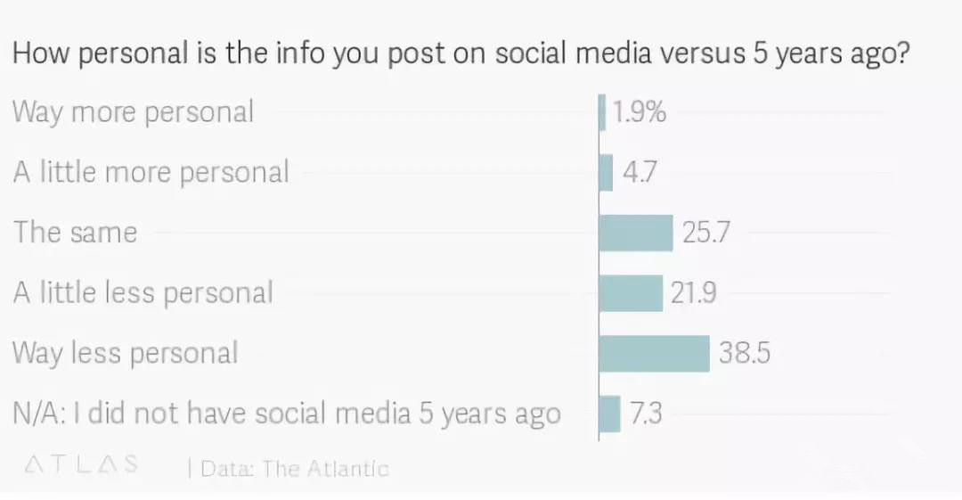 2016年The Information报道,至少在Facebook上,原创性质的个人分享(相对于发表情包或链接)正在减少。美国新闻学会(API)2015年的调查发现,千禧一代相比过去更加注重隐私问题。