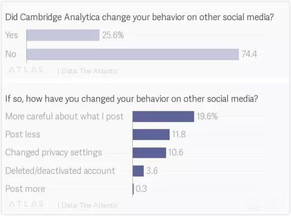 但也有一些人开始考虑在剑桥分析公司事件后如何使用或是否使用Facebook。在Beck的调查中,99%的受访者表示他们知道这一事件。如此高的比例当然也不稀奇,毕竟这项调查主要针对大西洋月刊的读者发出,而大西洋月刊密切关注报道了这一丑闻。这其中,有41.9%的人表示是因为知道这一新闻所以改变了使用Facebook的行为,主要是更加小心对待自己发布的内容。但Das提醒,“谈及隐私的时候,人们往往说一套做一套。”