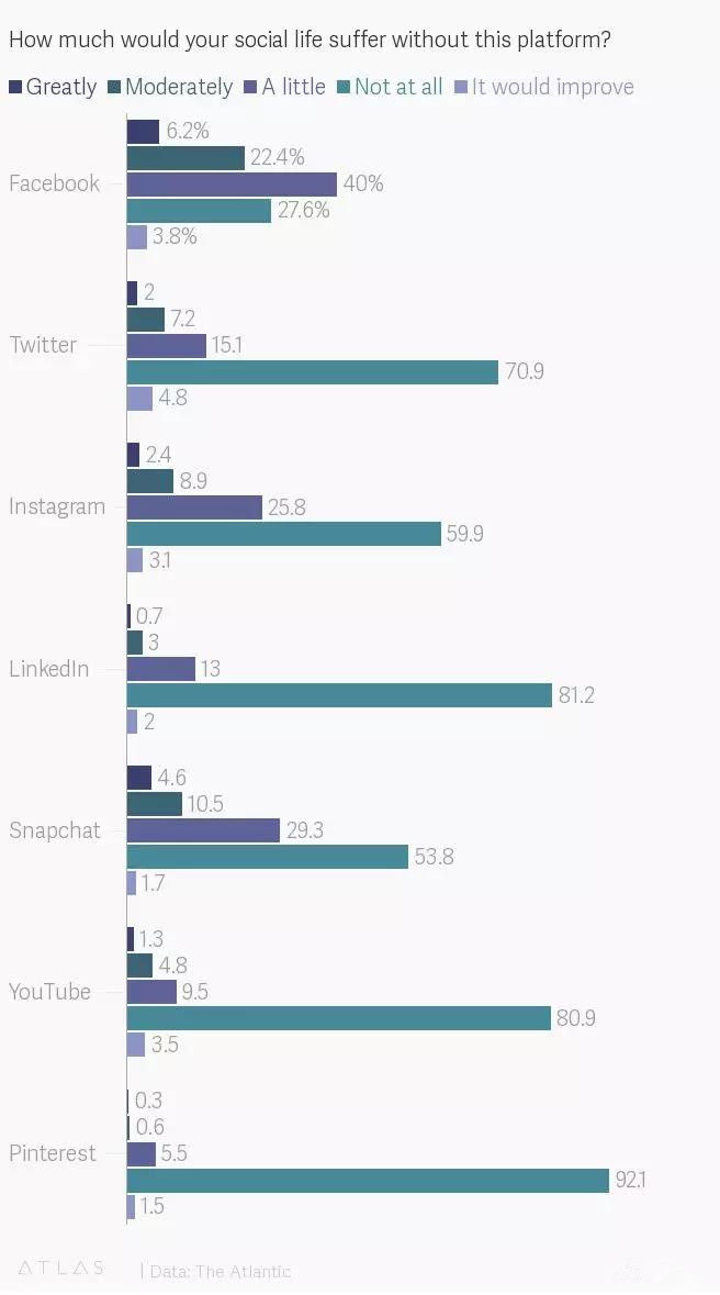 在Beck的调查中,大多数的Facebook用户(68.6%)表示,如果没有Facebook,他们的社交生活受损的状态会是“一点点”、“一般”、“很大”。而对其他社交媒体平台,多数人的态度是,没有它自己的社交生活“一点也不会”遭受损失。