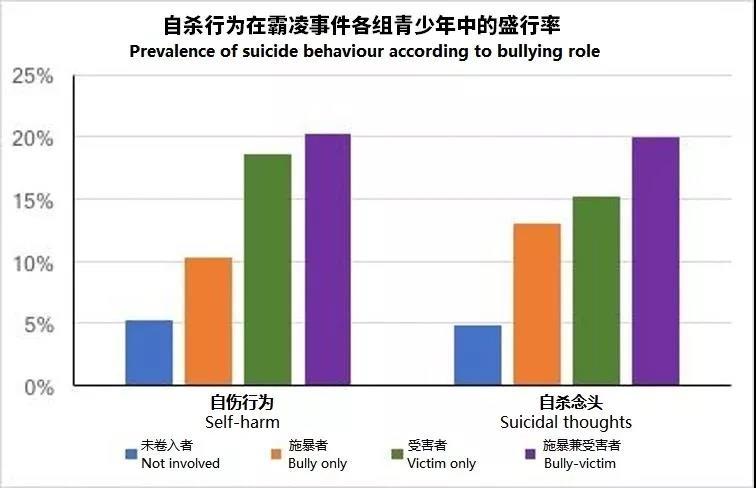 身为施暴兼受害者的青少年最有可能发生自伤行为(20%)和产生自杀念头(20%)。