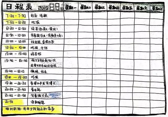 第一,写时间规划。每次放寒暑假,第一天必定郑重其事写下要干的事情。之后的每一天,从早八点到晚八点,每个时间节点都要写好。