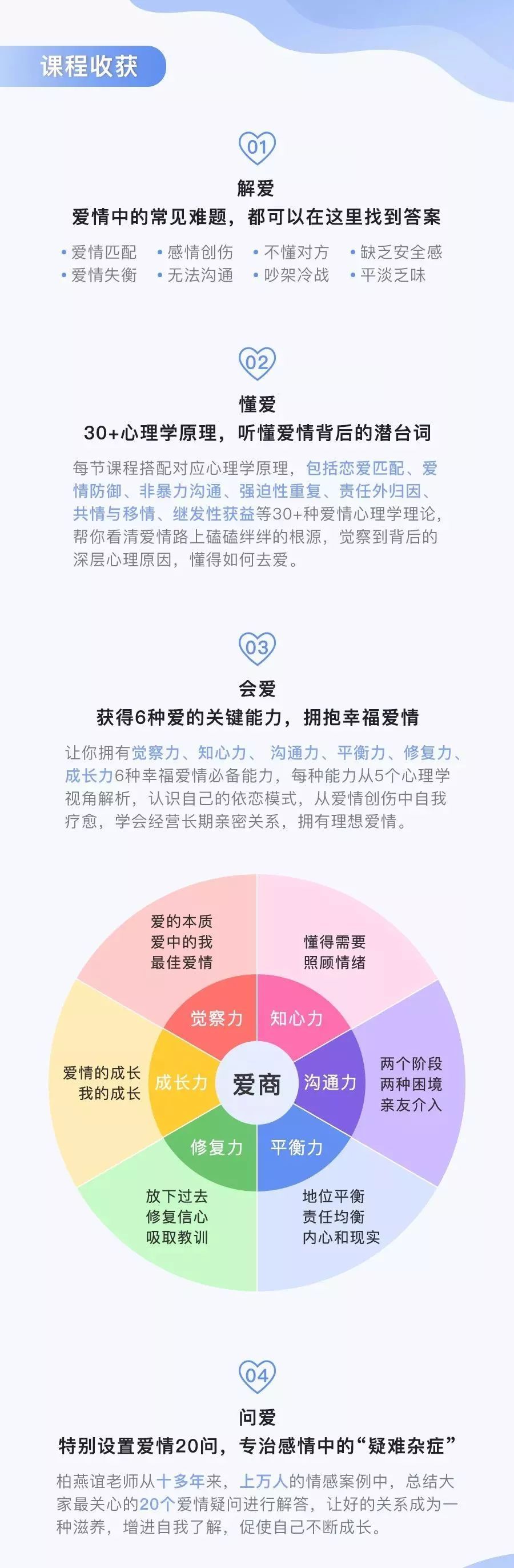 可是,爱情这堂人生必修课,却从来没有人来教我们,来帮我们培养爱的能力,来告诉我们,该如何去选择配偶,磨合期遇到问题要怎么办?吵架要怎么处理?怎么搞懂对方到底怎么想,怎么在平淡中维系感情等等。
