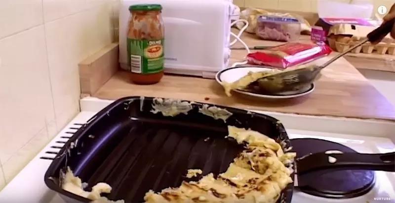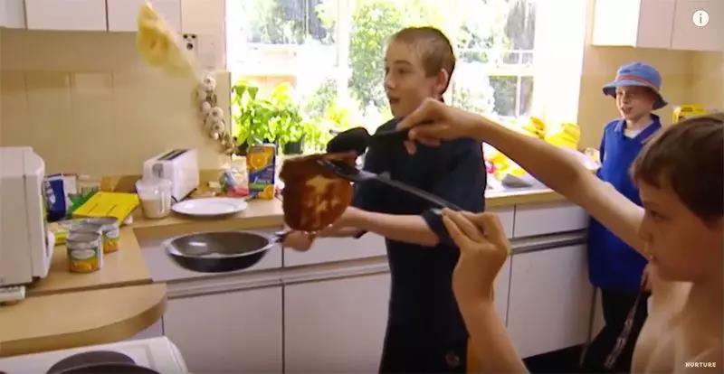 两个男孩手忙脚乱地想要努力做点能吃的东西,结果是一场与食物的肉搏战。