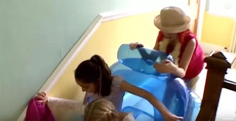 她们还一起把充气沙发推下楼梯当滑梯!