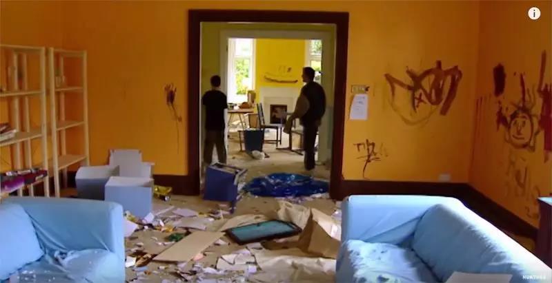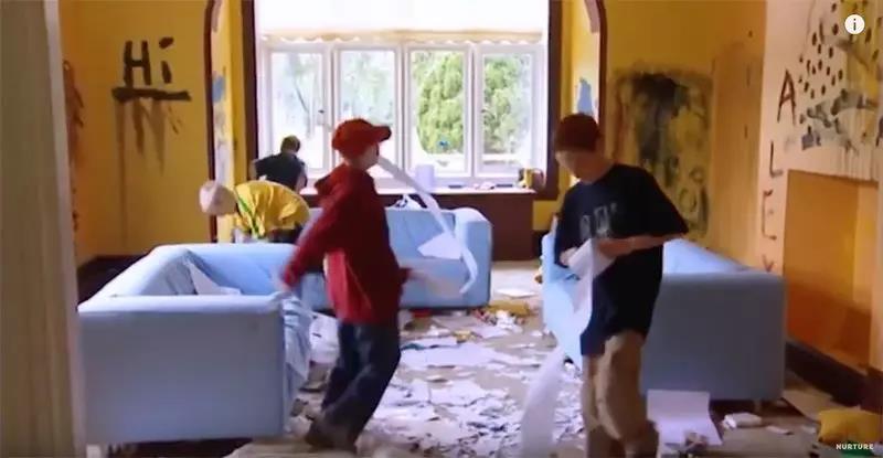 男孩们一进房子,就用油彩把墙面涂了个脏,爆米花也扔了一地,第一天下来,房子就已经一片狼籍。