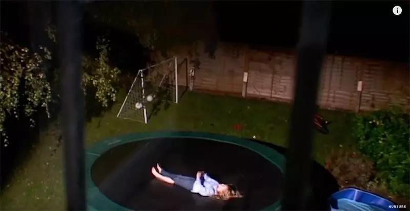 晚上,她也自己一个人在室外的蹦床上躺着。