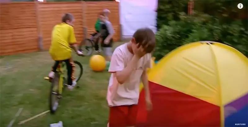 他决定在帐篷里睡,却也躲不开男孩们的围攻,他们轮流往迈克的帐篷上踢球。迈克伤到了脸,他气急了。