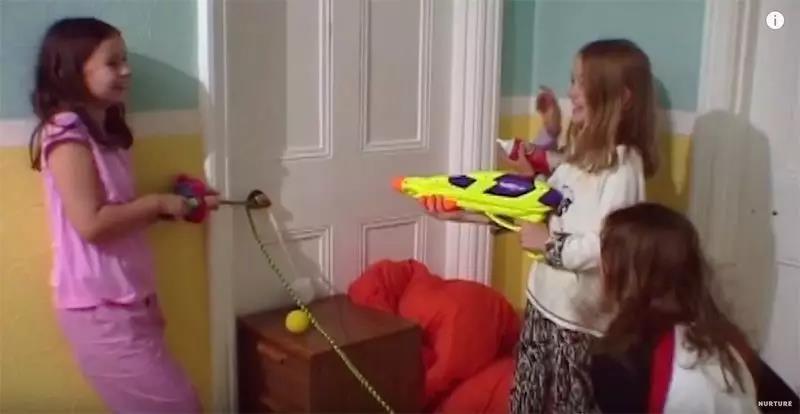 两个房间的女孩们开始不分青红皂白地互喷水枪,每个人的睡衣和床都湿了。