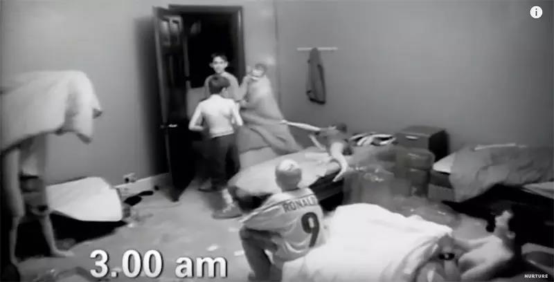 男孩们争得情绪激动起来,各种推搡、打门、踹门、拽被子,两个阵营的对抗逐步升级!大房间的男孩们死也要制造噪音,一直闹到凌晨3点。