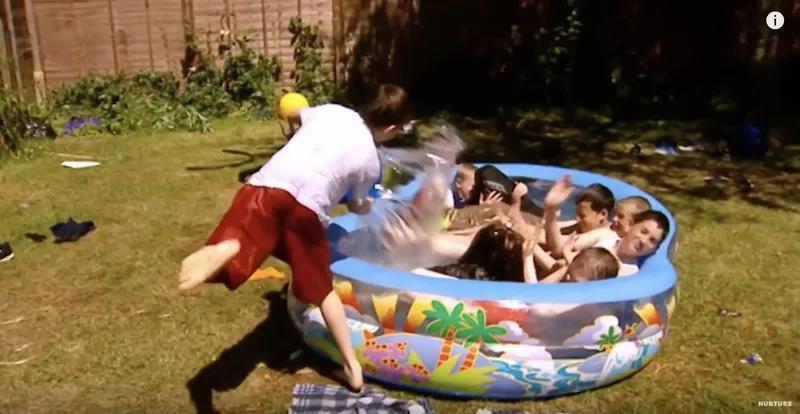这时,就需要更刺激的游戏才能让情绪再度高涨。于是他们架起充气游泳池,一个个都跳进了水里!