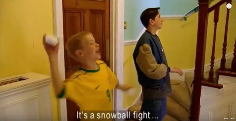 这下,战争正式开始了!两个房间的男孩都怒了。他们开始阵营鲜明地互扔东西!扔的物品越来越重,把墙都给砸了。