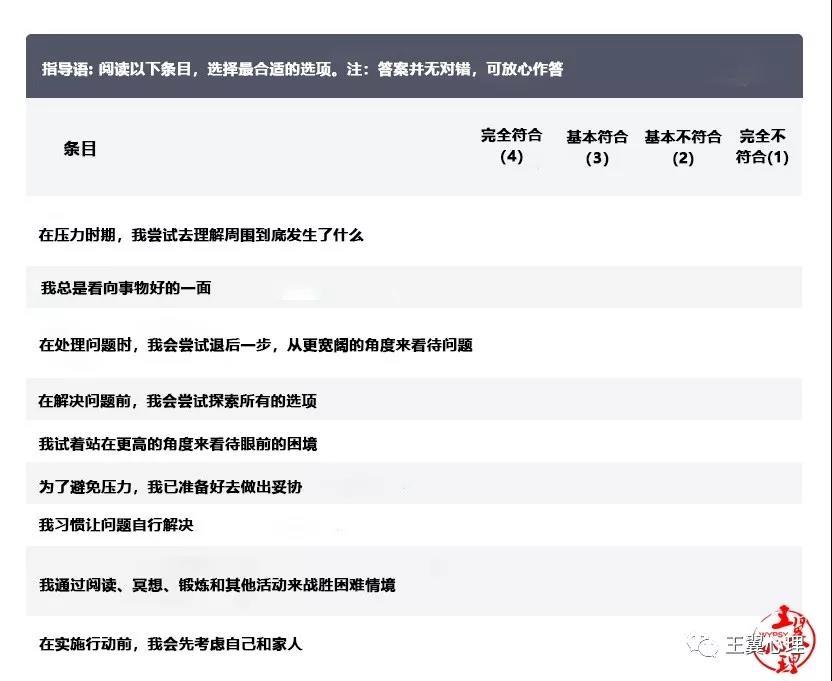 该表格由选择题组成,每个条目的得分范围在1-4;所有条目相加得到总分用来评估个体的应对技能水平,也可用作进一步改进的参照基准。分数越高表示应对技能水平越好。