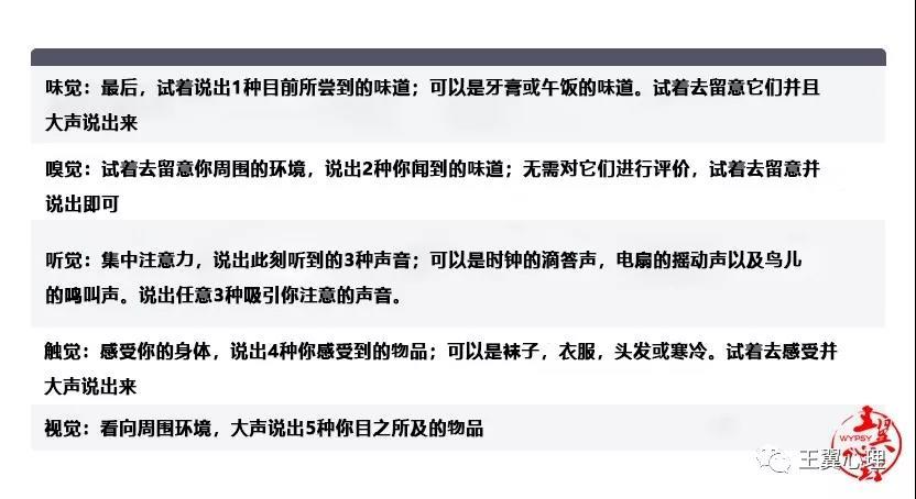 5-4-3-2-1技术可以帮助儿童利用5种感觉器官来留意自己的内部感受与外界环境,以及学会选择正确的方法去适应改变。 该练习具有简单和系统的特点,如下所示: