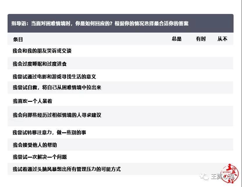 该量表描述个体在压力和困难情境下的行为模式。该测试为3点评分量表,1=从不,2=有时,3=总是。简要版如下: