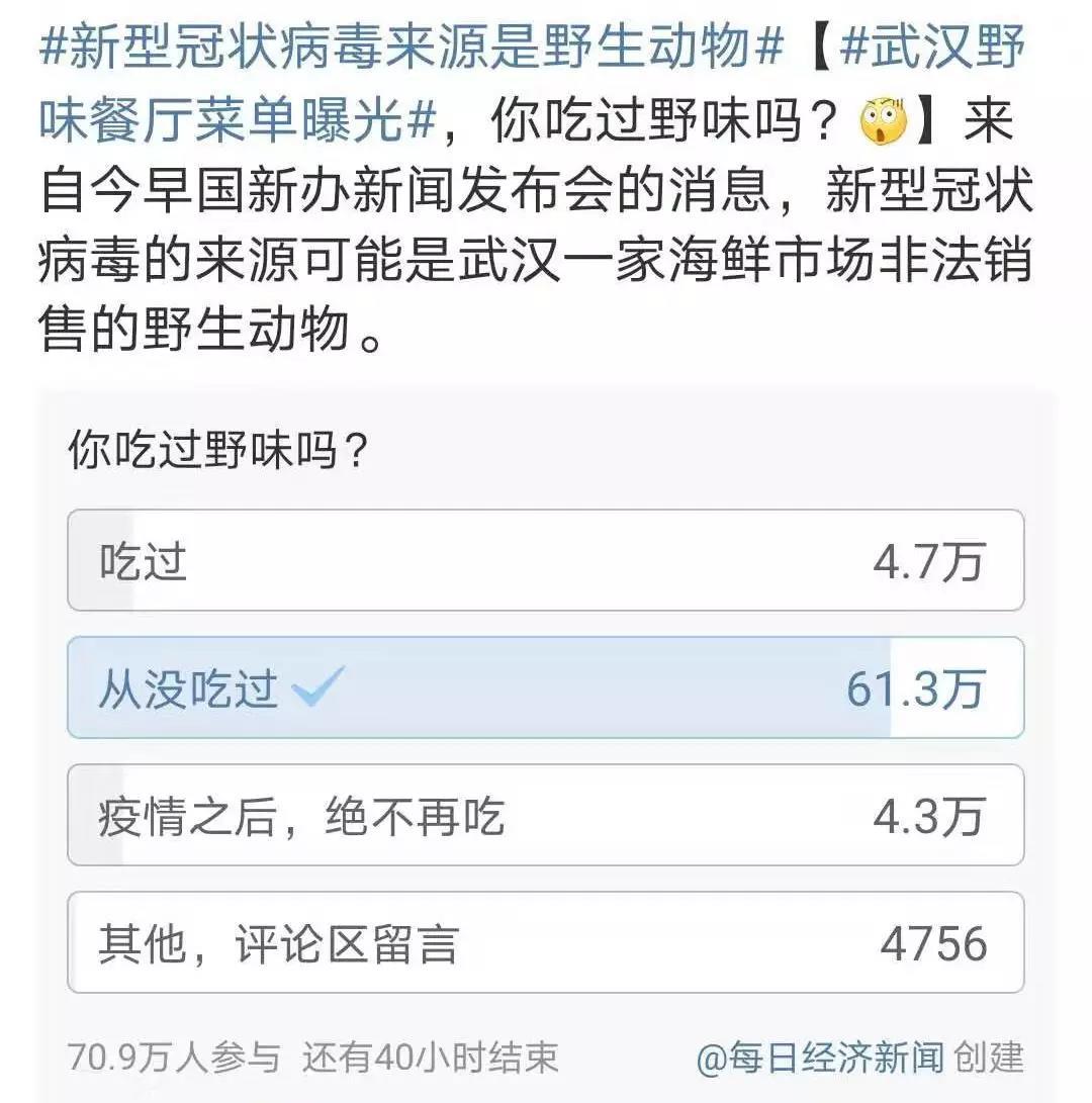 1月22日,每日经济新闻发起投票:你吃过野味吗?4.6万人选择了“吃过”。