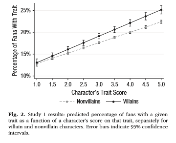 为了验证这个想法,研究人员分析了CharacTour网站上的数据,该网站是一个以角色为中心的在线娱乐平台,在本研究开展时,大约拥有232,500个注册用户。该网站的功能之一允许用户进行个性测验,并查看自己与编码为恶棍或英雄人物间的相似性。恶棍诸如伏地魔,维达,马勒菲森特和莫里亚蒂等角色,而英雄诸如福尔摩斯和尤达大师等角色。这些测验中的匿名数据让研究人员能够以非反派人物为基准,测试人们是否会被与己类似的反面人物所吸引。结果发现,随着人们与反派人物间相似性的增高,人们开始被他们所吸引。并且,用户最喜欢与他们有相似之处的恶棍。