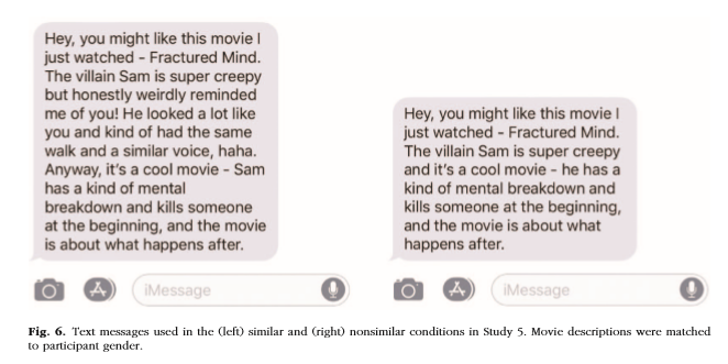 但是,却并非在所有情况下都是如此。当一群参与者被告知,一部新电影中有与他们相似的“超级恐怖”的虚构反面人物时,他们表示很高兴独自一人去观看这部电影。然而,如果这部电影作为第一次约会的选择时,反面人物就变得不那么吸引人了。显然,初次约会涉及潜在的重要社会判断。以任何方式被比作“令人毛骨悚然”的恶棍的风险显然会对参与者的自我形象构成威胁。但是第一次约会仅仅是一个特例。