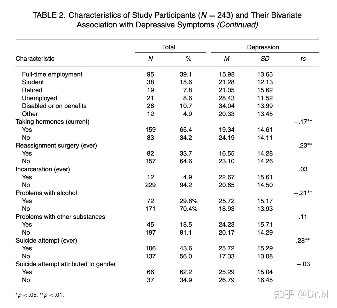 具体数据可以参考下表,我们不难看出,如果“性别不安“的人群有接受荷尔蒙注射(taking hormones)或者是手术(reassignment surgery),他们抑郁症的病症会显著下降(p < .01):