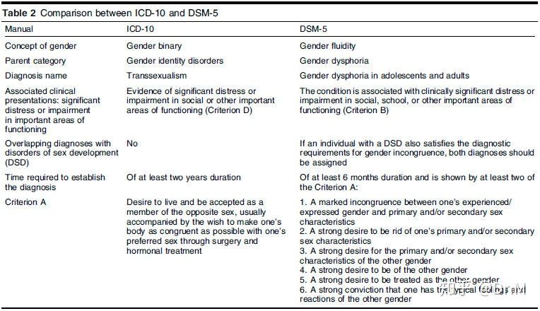 首先,“性别不安”作为一个诊断标签在DSM-5和ICD-10里都有存在的。前者是美国精神医学学会出版的Diagnostic and Statistical Manual of Mental Disorders, 5th Edition,后者是世界卫生组织出版的International Classification of Diseases, 10th Revision。