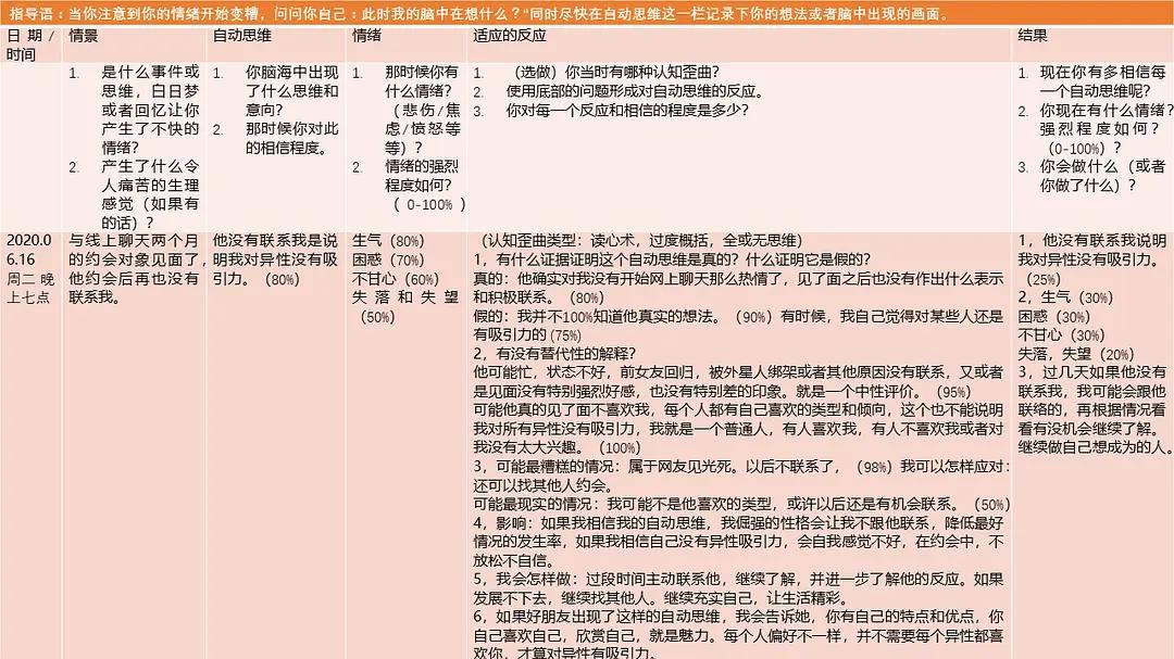 学习CBT的时候,当我们老师介绍这一个工具的时候,我和我的同学们并没有感觉有什么神奇之处,但当我们自己在作业中亲身使用时,还是有一点小惊喜的,很多人都反馈情绪有一定程度的缓解。