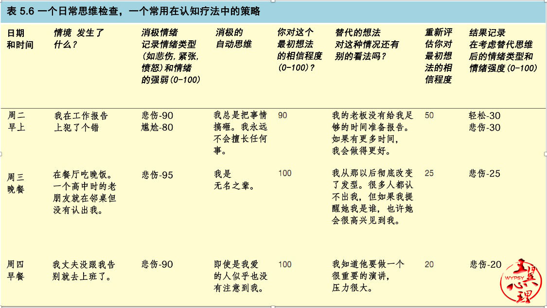 “识别功能不良的想法和想法造成的情绪,用更有建设性的思维替代病理性思维。” 下图是示例。(原图为英文,这里做了翻译)