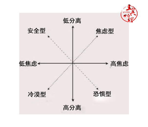 依恋关系分为4个类型:安全型(低焦虑低分离),焦虑型(高焦虑低分离),冷漠型(低焦虑高分离),恐惧型(高焦虑高分离)。”