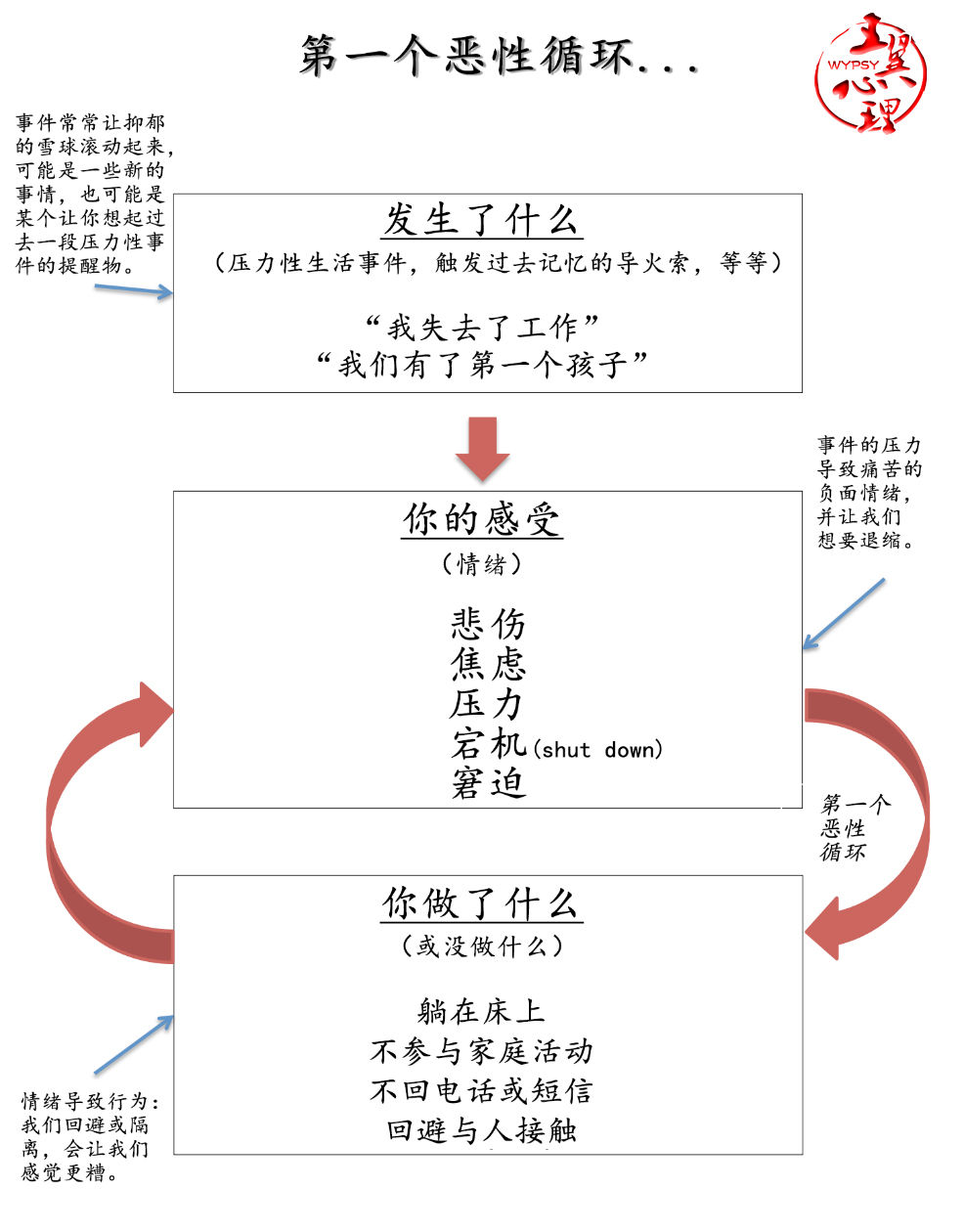 抑郁的恶性循环如图,原图是英文,这里做了翻译。