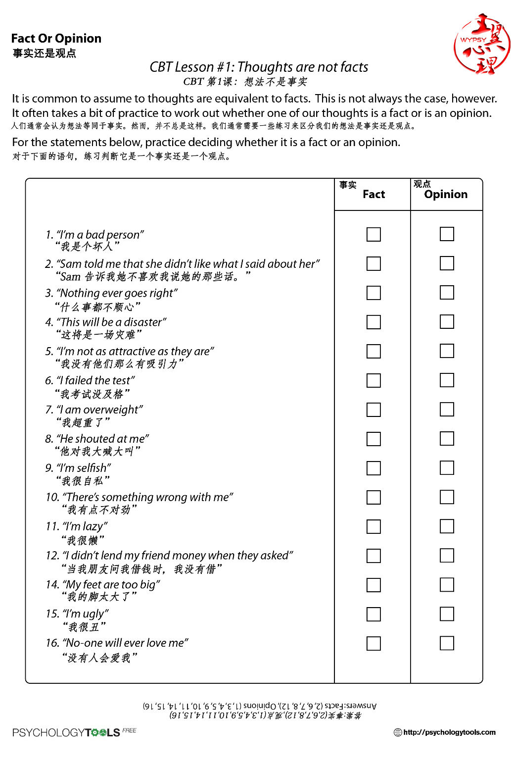 这张图表(中文是添上去的翻译),判断是事实还是观点。我的判断全对,但 “要学会用同样的态度看待自己的躯体症状。