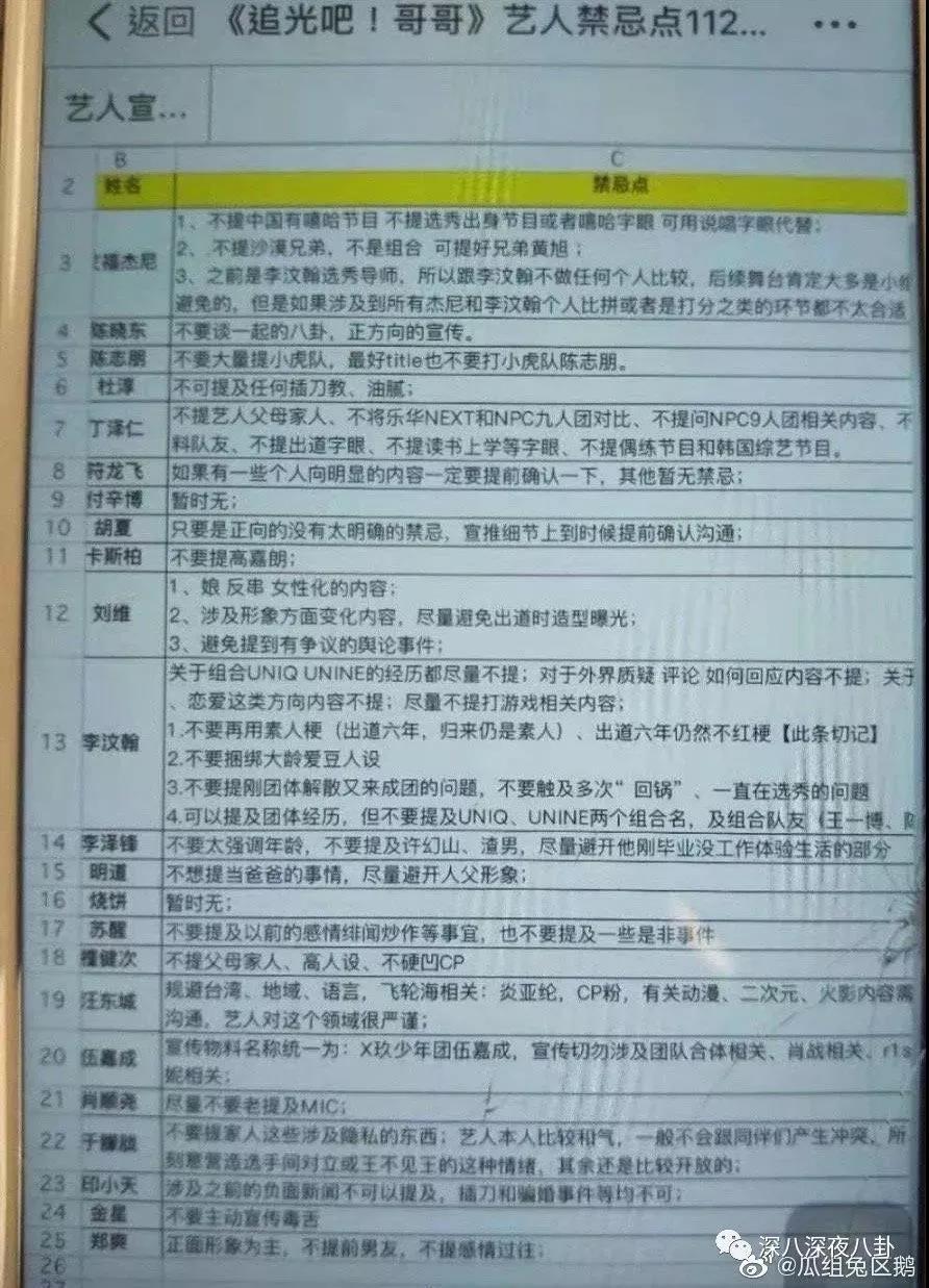 网上还曝光一份《追光吧哥哥》“艺人禁忌名单”,明确表示: