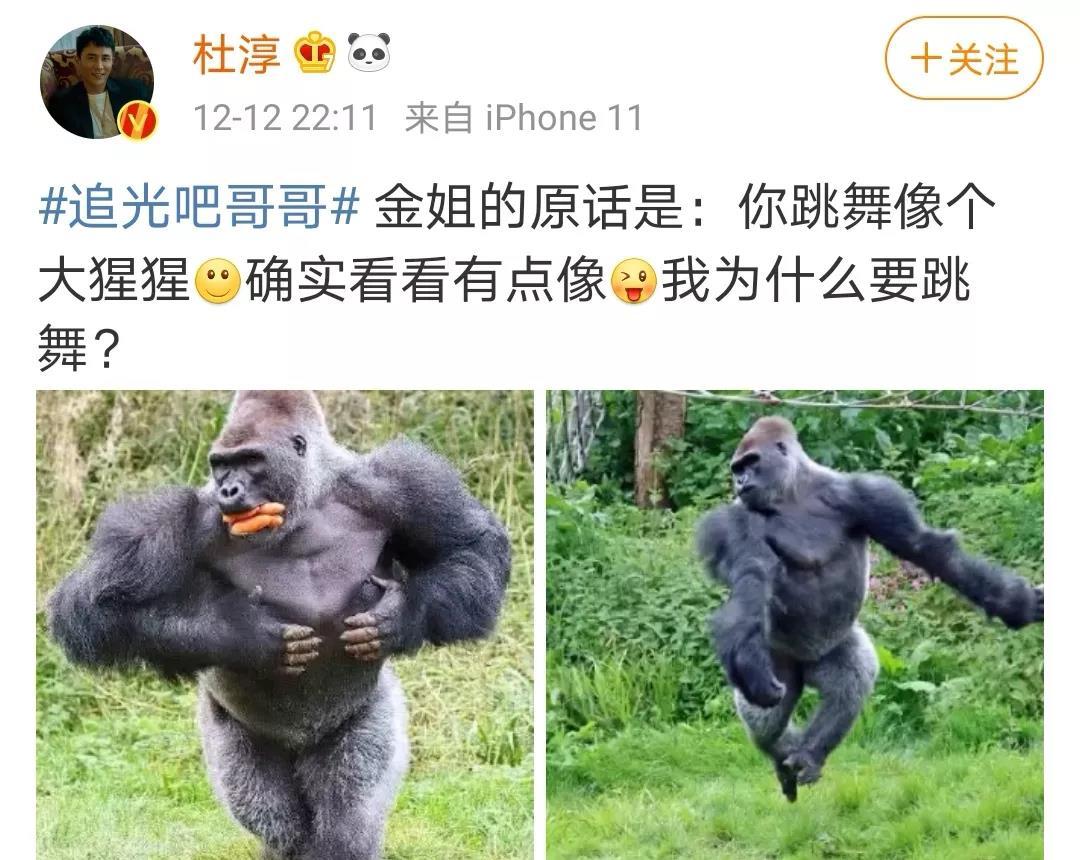比如前一阵子刚演完《八佰》的杜淳,上台尬舞,被金星和郑爽吐槽“像大猩猩”,不反思不改进,转手微博就发了大猩猩图自黑。