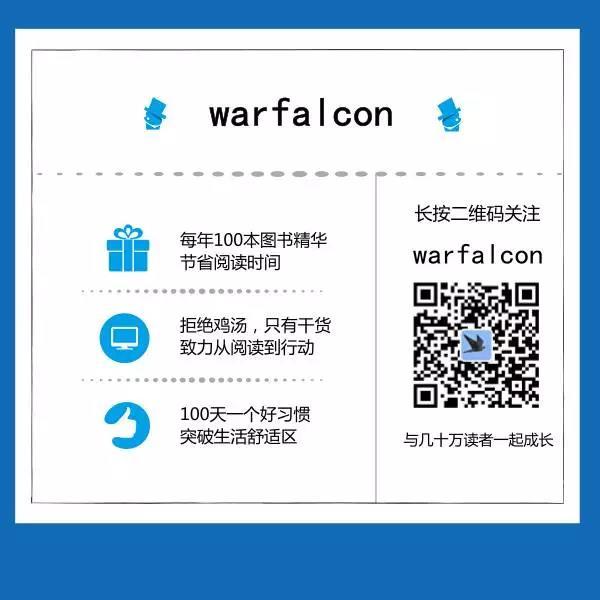 作者简介:微信公众号——warfalcon(ID:read01)想每年读完100本书吗?想在100天内培养一个好习惯吗?想搞定拖延和注意力不集中吗?关注我,让你成为一个行动者,跟几十万读者一起成长,欢迎参加100天行动