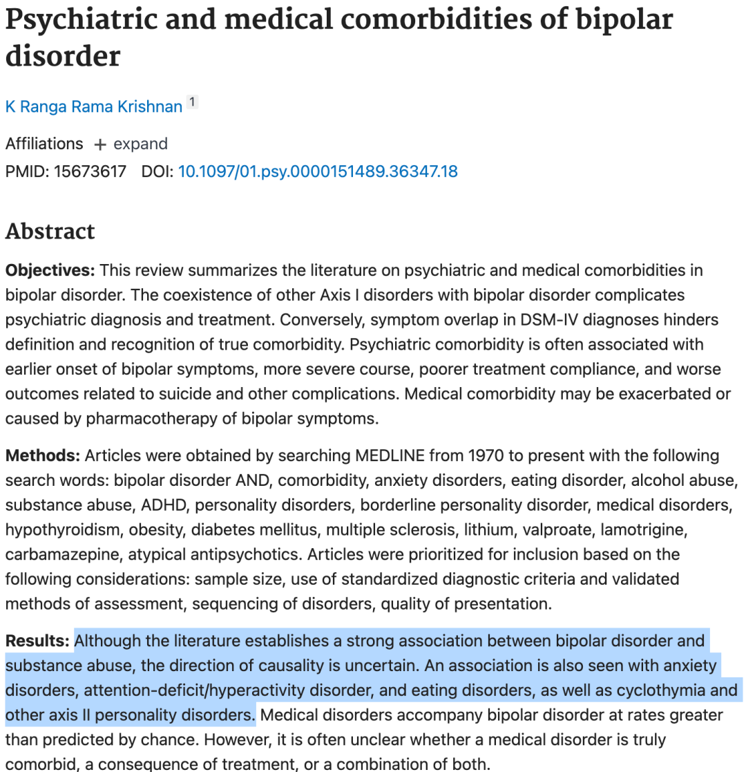 双相障碍共病其他障碍。尤其是酒精和物质滥用,双相患者酒精和物质滥用率高达69%;共病ADHD、焦虑、创伤后应激障碍(PTSD)以及强迫症(OCD)、进食障碍也较为普遍。