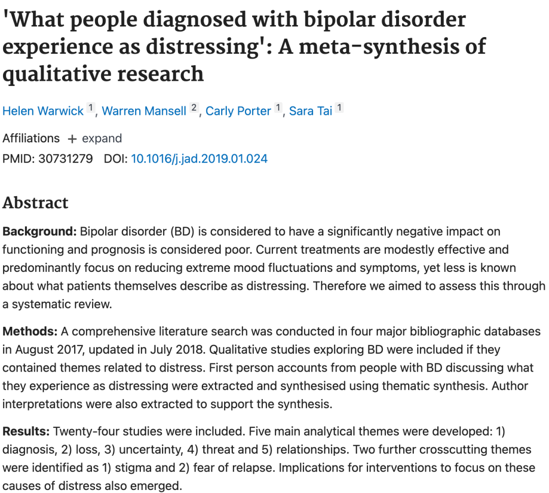 2019一篇综述研究,以双相障碍患者为第一视角,讲述了因双相产生的病耻感、不确定感以及绝望感的心路历程,描述了双相障碍诊断带来的恐惧、对疾病复发的担忧以及双相对人际关系和社会功能造成的显著负面影响。