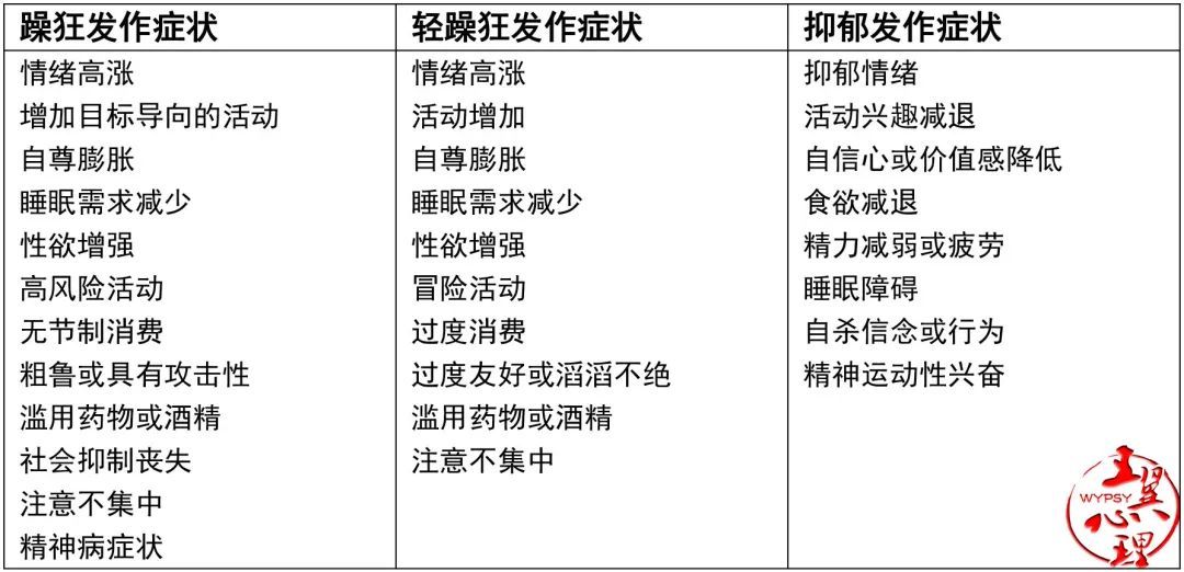躁狂,轻躁狂与抑郁发作详情见下表: