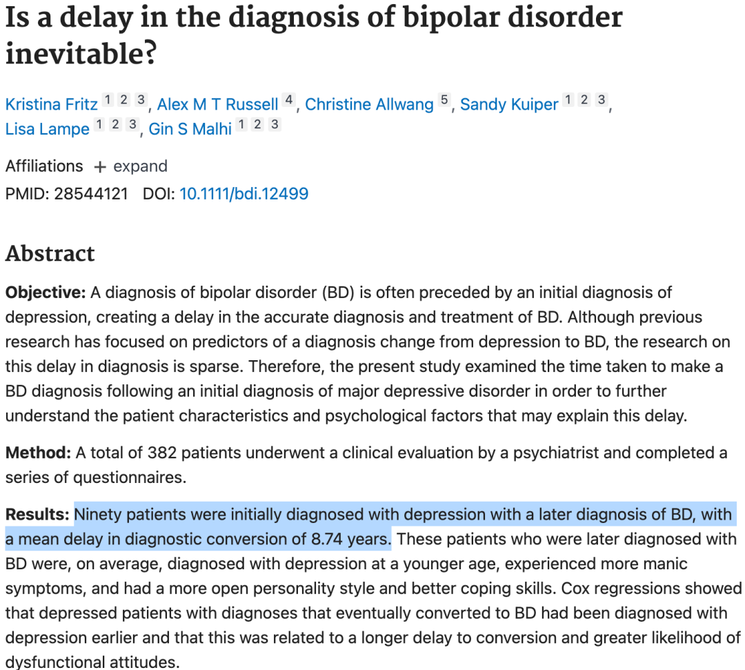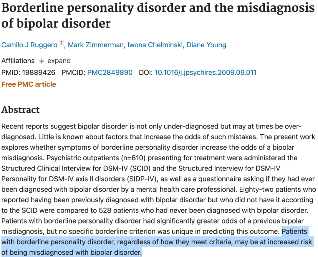5、边缘性人格障碍(BPD)症状常被误诊为双相。一项BPD患者调查显示,BPD误诊率约为40%,双相是常见误诊结果之一。