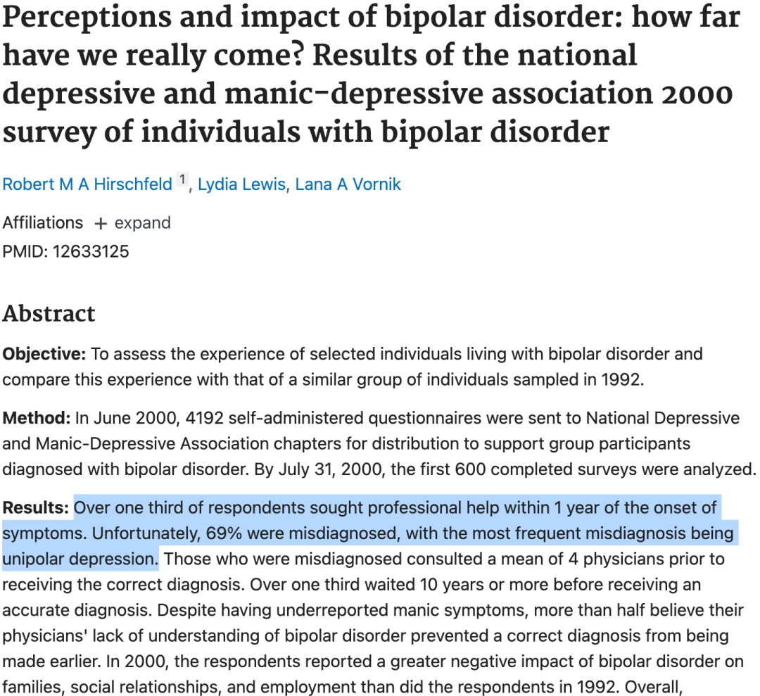 1、双相和抑郁难以区分。一项双相患者调查显示,双相误诊率高达69%,最易被误诊为单相抑郁。