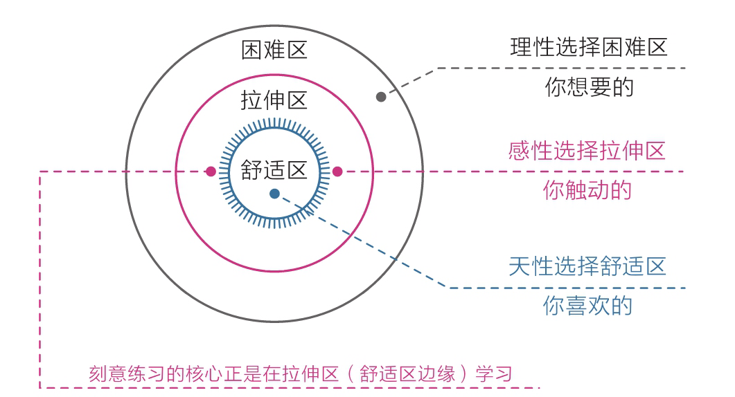 在《认知觉醒》这本书中,作者对舒适区、困难区、拉伸区做出了精准的定义。