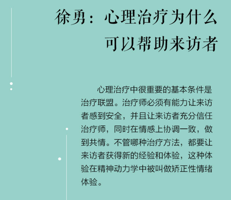 不管任何心理治疗流派,都会帮助来访者获得新的认知,而这些认知是否真的会带来改变,取决于来访者是否在咨询中获得新的体验性部分,特别是建立在良好治疗联盟基础上的矫正性情绪体验。