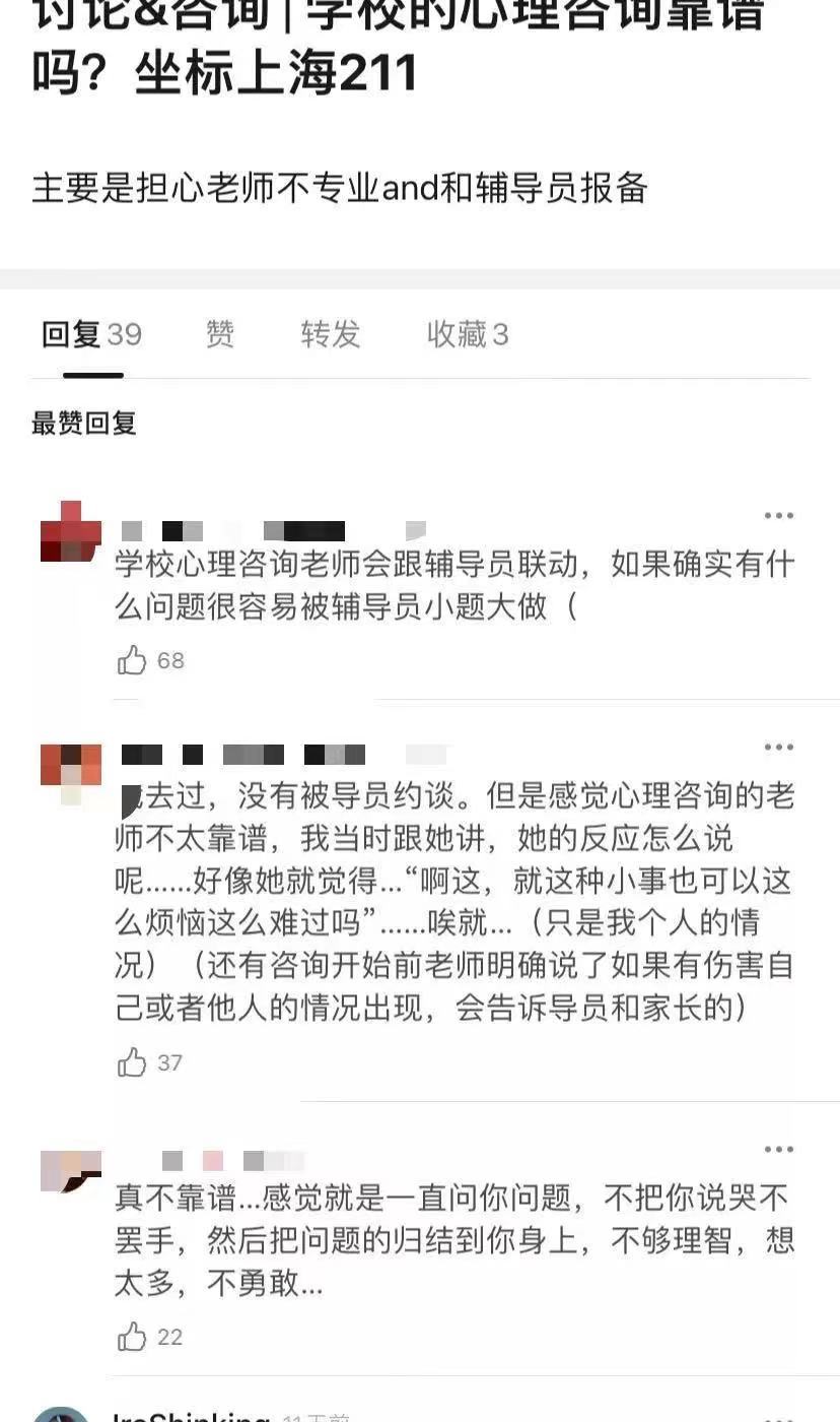 另外,也有一些同学反馈,自己给予学校足够的信任,诚实地作答,但也因此被标记为“心理不健康”至此受到从辅导员到班主任乃至院长的特殊对待,不堪其扰。这些同学在公开论坛表示,千万不要太信任学校的心理测评。