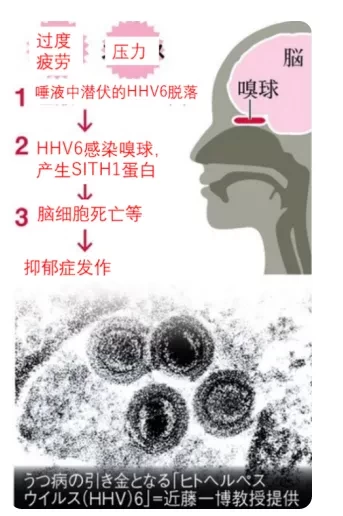 他们发现,当人体免疫力低下,一直处于疲劳、压力下时,唾液中潜伏的疱疹病毒HHV-6B会增多,然后感染了大脑中的组织“嗅球”,产生一种蛋白质,叫做SIHT-1蛋白。