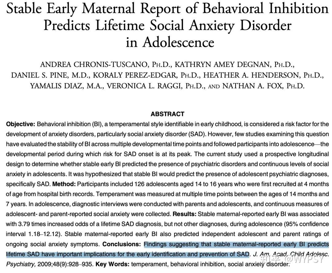 一组针对14个月大的婴儿-7.5岁大的儿童跟踪调查,显示气质类型为行为抑制性的婴儿,在青春期和成年早期更易显示出焦虑症状,气质类型为行为抑制(对陌生人和场景表现适应苦难)的儿童更容易发展出社交焦虑障碍。