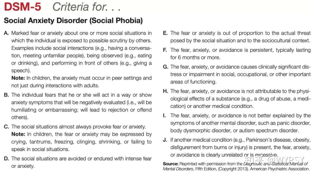 基于DSM-5,社交恐惧的主要特征是,过分害怕在社交情境下受到消极的负面评价以及伴随对类似情境的回避行为。每个个体所恐惧的社会情境因人而异。