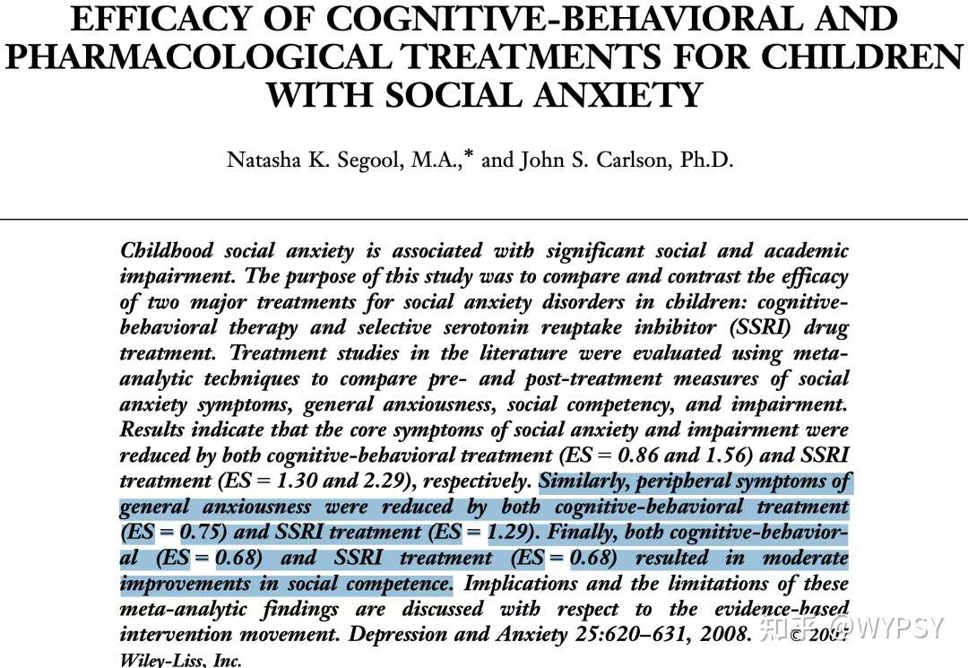 这项分析研究对14项原始研究中的数据进行了荟萃分析,总计332名患有SAD的被试,年龄在5到19岁之间;其中七项研究中,部分被试接受认知行为CBT治疗时程平均为11.9周,接受SSRI类药物治疗的时间平均持续了11.1周。