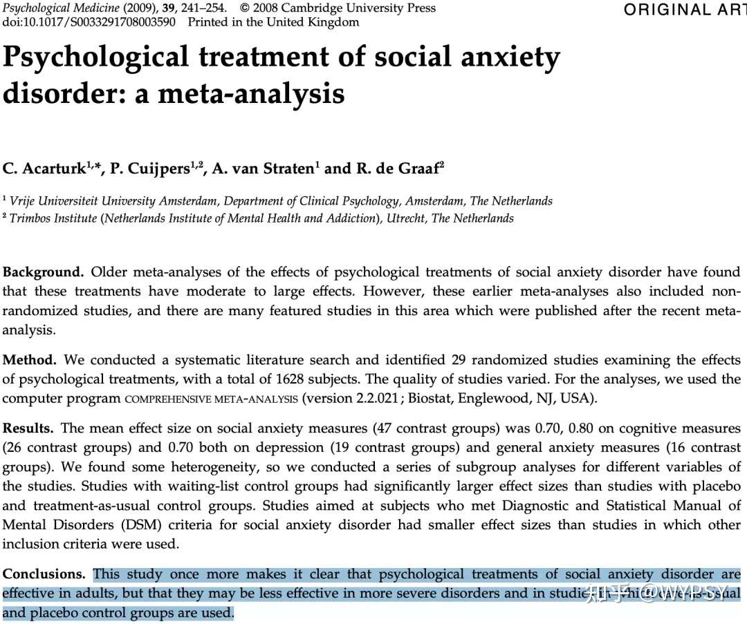 在过去的二十年中,一些荟萃分析表明,药物和心理干预都可有效治疗SAD。大多数研究评估了认知行为CBT的功效性,结果发现它可同时用于治疗青少年和成人的社交焦虑障碍。由Acarturk(2009)进行的荟萃分析研究,其中涉及到30项原始文献,共1628名患有社交焦虑障碍的成年被试(979名被试接受治疗“实验组”,649名被试分到了“控制组”);年龄范围18至65岁。在其中14项比较研究中,心理治疗以一对一形式进行,而另外的15项比较研究中,使用团体心理治疗