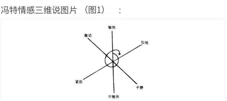 冯特最早在1986年提出情感维度的观点,他认为情感不能只根据愉快和不愉快予以说明,而是需要三种纬度(愉快——不愉快、紧张——松弛、激动——平静)才能做出有效的描述。