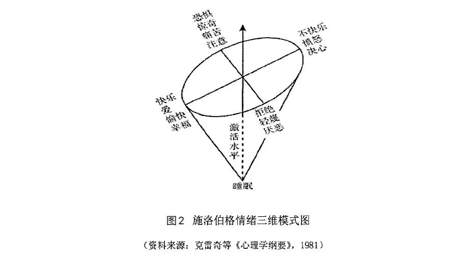 美国心理学家施洛伯格基于面部表情的研究,于50年代提出了情绪的三维理论,按愉快—不愉快,注意—拒绝和激活水平把具体情绪排列在一个倒立的椭圆椎体上。椭圆切面的长轴为快乐维,短轴为注意维,表明情绪的快乐度比注意度可作出更精确的区分。