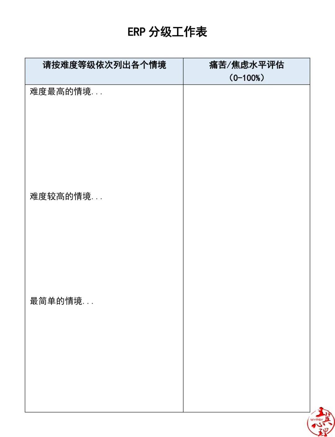运用ERP分级工作表将个体当前受强迫思维引发的恐惧而回避的情境一一列出。并通过ERP症状监控工作表帮助个体根据焦虑/恐惧触发水平对情境进行分级(不实施强迫行为的情况下),把难度最高的情境放在表的最上面,难度中等的依次添加在中间,最容易的置于最下面。