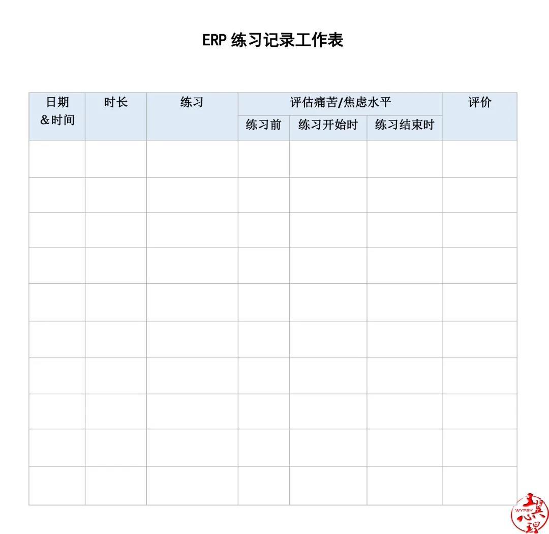 完成ERP分级工作表后,选择首次练习的任务,并在ERP练习记录工作表上记录,然后选择合适时间进行练习。要确保自己在不实施强迫行为的同时,坚持待在暴露情境下直到痛苦水平距离练习开始时降低50%为止。