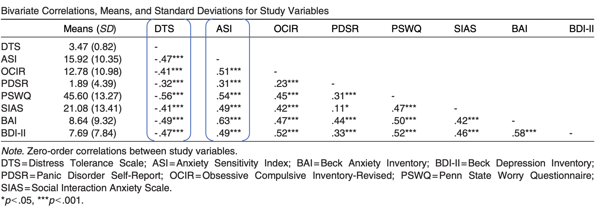 2、对于焦虑敏感性较高的个体通常伴有对负性情绪的不耐受distress tolerance (DT),现有的研究表明焦虑敏感性较高的个体,对痛苦的耐受度较低的个体通常与焦虑相关障碍(强迫,惊恐,社交焦虑,广泛性焦虑等)显著相关。