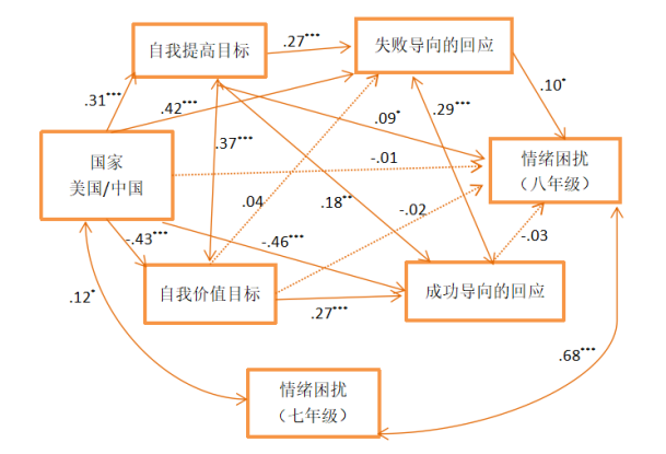 这说明中国和美国的母亲通过采取自我提高的目标直接导致孩子的情绪困扰,但是同时说明自我提高的目标还存在其他可能的对于孩子情绪影响的机制。